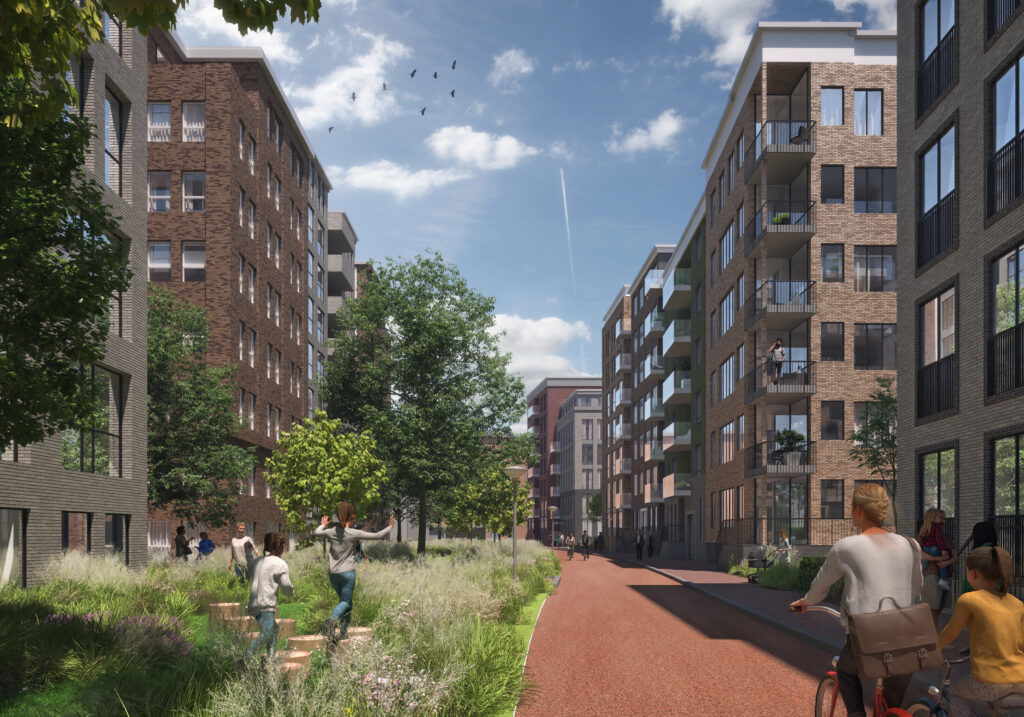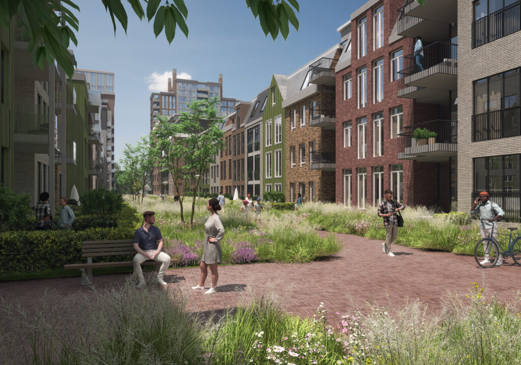 Aan de kop van de straten komen karakteristieke gebouwen. Ze heten je officieel welkom in de wijk. Wat statig en formeel, met een herkenbare stijl en wisselende kleuren. Het is een stedelijke straatwand met een ingetogen ontwerp. Met metselwerk in warme kleuren. Afwerking van de fijnere details in hout. En een enkele houten gevel. Daken die in hoogte verspringen. En balkons aan de straatzijde.
